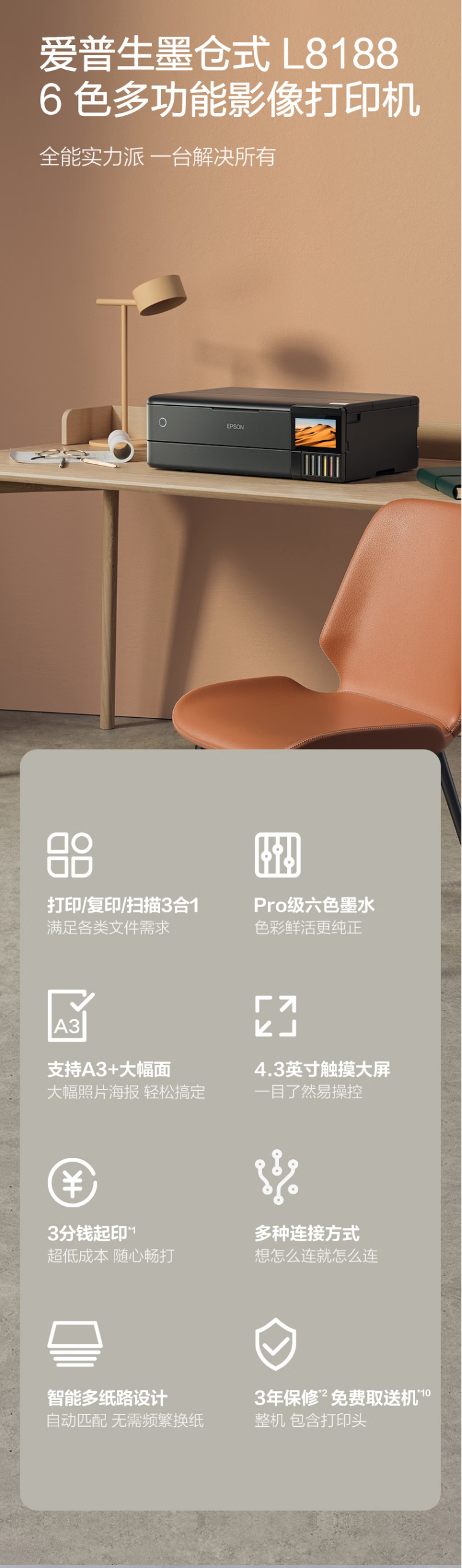 爱普生/EPSON 8188 A4 彩色打印机 墨仓式6色高端照片一体机